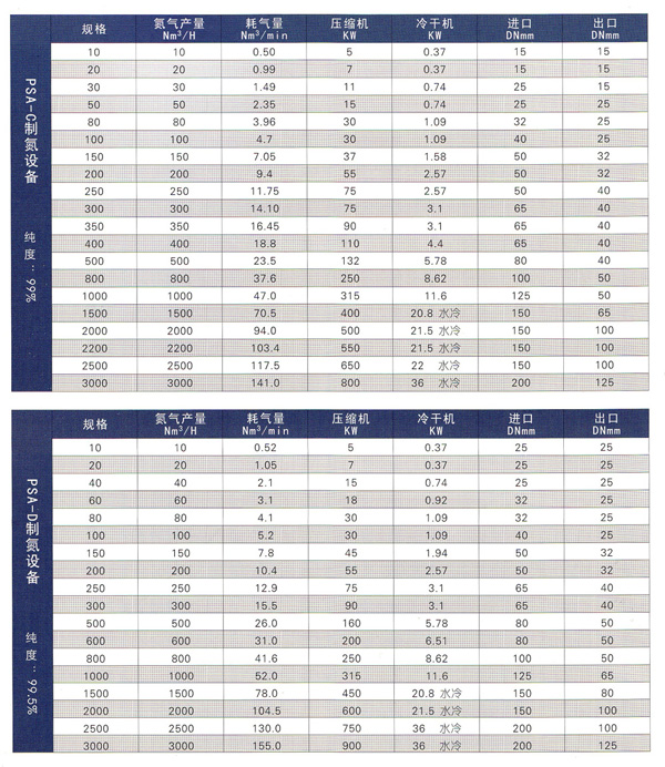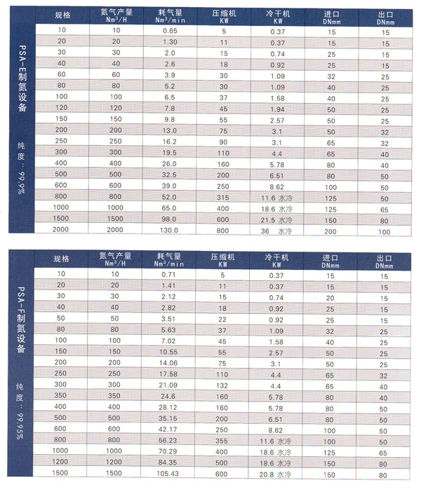 變壓吸附制氮機(制氮設備)技術參數如下: