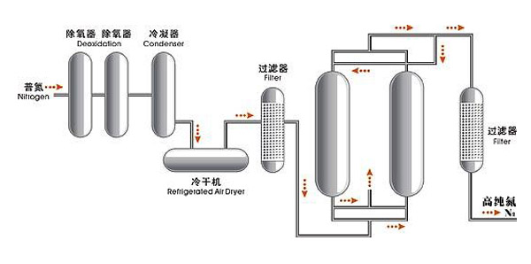 氮?dú)饧兓b置是以變壓吸附制得的粗氮為原料,經(jīng)加氫催化除氧,冷凝水吸附兩級干燥除塵,去除氮?dú)庵械难酢⑺蛪m埃等雜質(zhì),從而獲得高純度的氮?dú)狻F淙丝诘拇值兌纫?ge;98%,出口精氮的純度≥99.999%,氧含量≤3μm,露點(diǎn)≤-65℃。